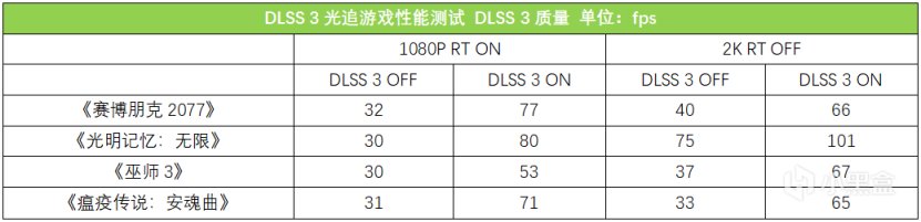 3A大作開啓光追後對硬件的要求極高,可以看到RTX 4050 Laptop GPU在1080P分辨率下的幀率很低,沒辦法正常的遊玩。而開啓DLSS 3質量模式之後,幀數的表現具有飛躍式的增長,平均提升幅度高達128%。除了《巫師3:狂獵》,其他三款遊戲都從30fps左右提升到了流暢的70fps。在2K分辨率下,RTX 4050 Laptop GPU開啓DLSS 3質量模式之後平均也有70%的提升,對流暢度要求高的玩家完全可以選擇降低一檔基礎畫質或者DLSS分辨率來獲得更高幀率。