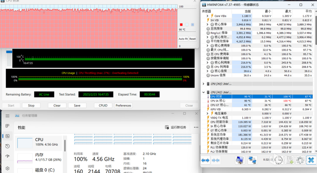 室溫25℃左右,在AIDA64中單考處理器(單考FPU),模式設定爲性能模式,考機30分鐘以後:i7 13700HX穩定跑在119W的狀態下,大核頻率約3.8GHz,此時處理器大核頻率維持在4.4GHz以上,溫度90℃左右。該機的穩定輸出功率屬於大幅度超出基礎功耗的水平,溫度表現也非常出色。