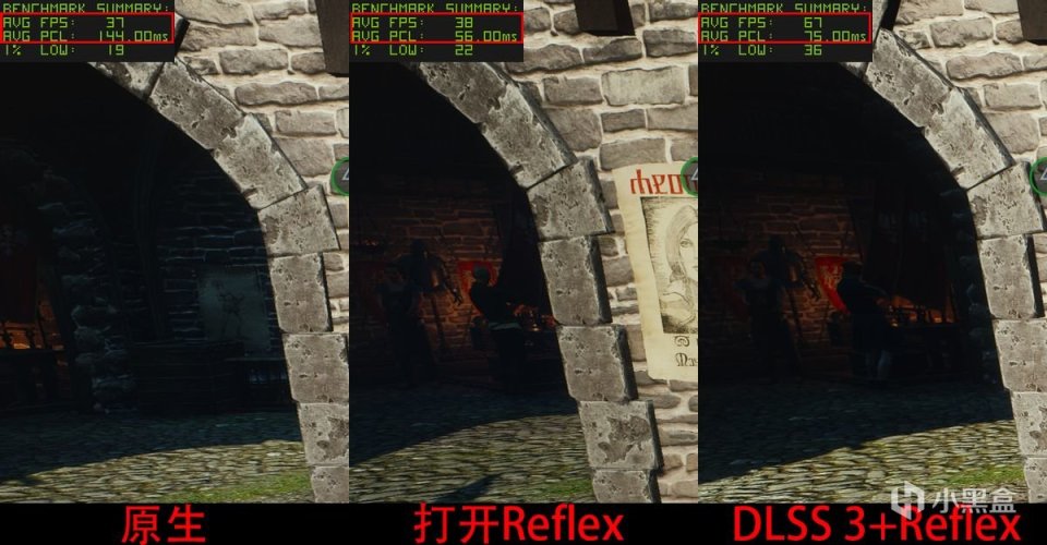 補幀本身會產生一定的延遲,但通過幀率的大幅提升和NVIDIA Reflex低延遲技術,可以有效降低遊戲延遲。在開啓DLSS 3+Reflex後,遊戲的實際延遲大幅度降低了,開啓DLSS 3的情況下PCL延遲只略高於打開Reflex的情況,但遠低於原生延遲。