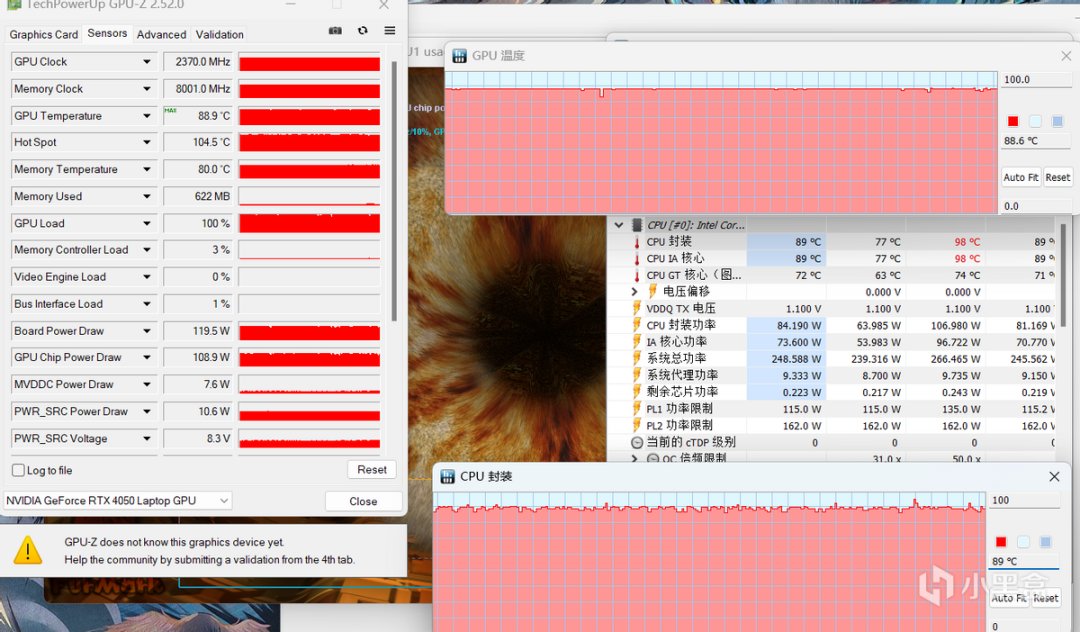 將星X15 AT 23款搭載了全新升級的“疾風散熱4.0”散熱系統,配備79片定製化葉片的雙渦輪風扇模組,擁有6根導熱管以及4個散熱出風口,可在高負載場景下快速排出核心熱量,保證性能釋放。在室溫25℃左右,利用AIDA64和FurMark進行雙考測試,半小時後i7 12700H處理器的封裝功耗約84W,溫度約89℃。RTX 4050 Laptop GPU的功耗在118~122W之間,頻率2370MHz左右,溫度約89℃。整機滿載的性能釋放達到了203W,輕鬆壓住了i7 13700HX+RTX 4050 Laptop GPU。