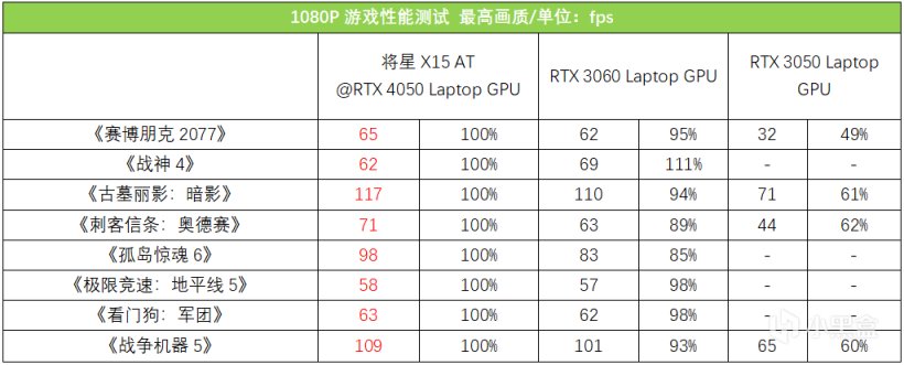 從實際的遊戲測試來看,RTX 4050 Laptop GPU給我們帶來了比較大的驚喜,雖然RTX 4050 Laptop GPU在基準性能測試中略微落後於RTX 3060 Laptop GPU,但實際的遊戲幀率做到了反超。除了手動跑分的《戰神4》之外,幾乎在所以遊戲中的平均幀率都領先RTX 3060 Laptop GPU 5%以上,最大領先幅度達到11%。有對照的成績中,RTX 4050 Laptop GPU平均領先RTX 3050 Laptop GPU的幅度達到58%,實現了最高畫質下流暢運行1080P遊戲。