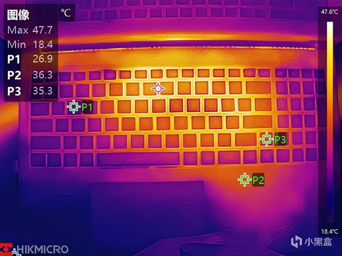 筆記本性能模式下雙考滿載時的噪聲比較大,用戶位大概爲54分貝。考機30分鐘後,鍵盤區域熱量堆積在右側中部區域,最高在47℃左右,此區域的熱感很明顯,W、S按鍵區域的溫度在27℃左右,觸控板右上方的腕託區域依然存在可以覆蓋到手掌的積熱區域。