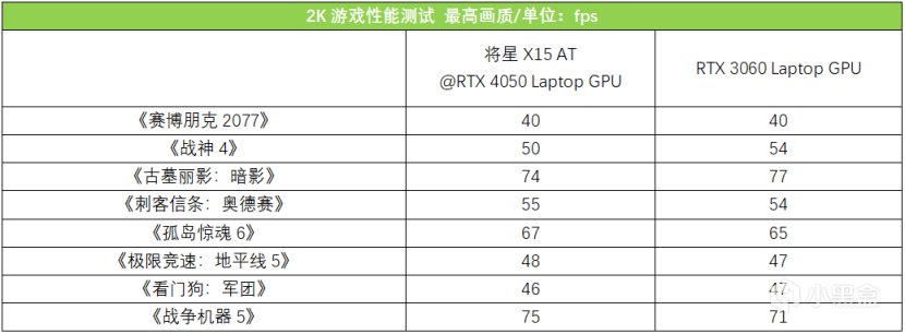 RTX 4050 Laptop GPU擁有徵服1080P遊戲的實力,從一定程度上講,制約它發揮的可能不是性能而是這塊FHD屏幕了。因此,我們在外接2K顯示器的情況下又進行了2K遊戲性能測試,RTX 4050 Laptop GPU的表現同樣非常不錯,參測遊戲的平均幀率和RTX 3060 Laptop GPU互有勝負,並沒有出現我們預想的由於顯存位寬瓶頸導致的2K成績明顯落後RTX 3060 Laptop GPU的情況,RTX 40系列Laptop GPU的架構和頻率優勢功不可沒。