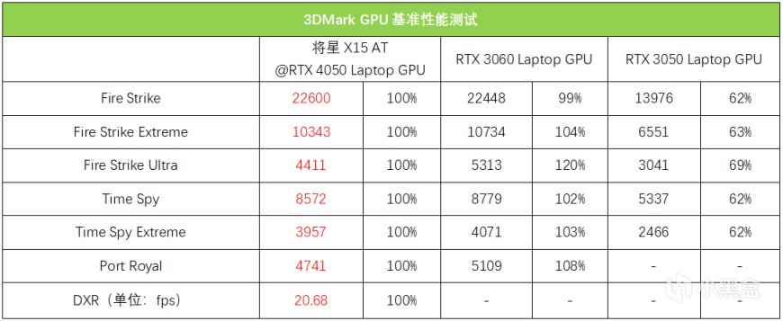 Time Spy測試項目中,RTX 4050 Laptop GPU得分爲8572,與RTX 3060 Laptop GPU的差距只有3%,Fire Strike的得分爲22600,比RTX 3060 Laptop GPU多了152分。只有在4K分辨率的Fire Strike Ultra項目中,RTX 4050 Laptop GPU才明顯落後RTX 3060 Laptop GPU。光追性能方面,RTX 4050 Laptop GPU的PortRoyal得分爲4741,純光追場景的DXR測試則可以達到20.68fps。
