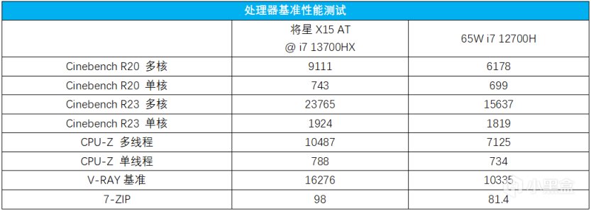 從基準測試來看,i7 13700HX和i7 12700H的多核性能差距非常明顯,在Cinebench R20多核中,將星X15 AT 23款的測試成績爲9111pts,比i7 12700H測試成績強了47%。在Cinebench R23多核中的成績達到了23765pts,比老款的i7 12700H強了52%。CPU-Z的多核成績提升也爲47%。而在更高頻率的加持下,處理器單核性能提升了6%左右。V-RAY基準測試項目,i7 13700HX的分數達到了16276,領先幅度高達57%,7-ZIP綜合成績也從81.4GIPS提升到了98GIPS。
