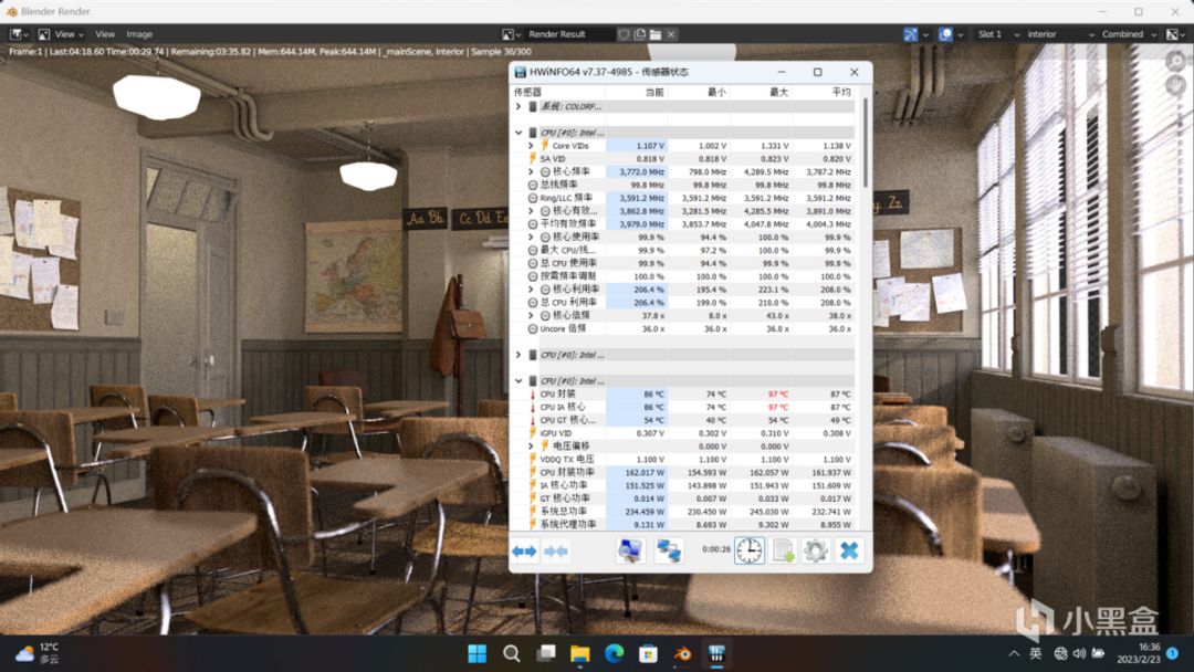 長時間的滿載測試中,我們選擇了Blender渲染來考查該機的性能表現,測試項目爲耗時相對較長的Classroom場景。將星X15 AT 23款的測試耗時爲4分18秒,而上一代65W i7 12700H的渲染耗時是6分39秒。在Blender渲染測試時,該機有持續20秒左右的性能爆發期,可以達到PL2的162W設定功耗,接着逐漸降回130W,使得筆記本面對各種重度應用時,效率得到了進一步提升。
