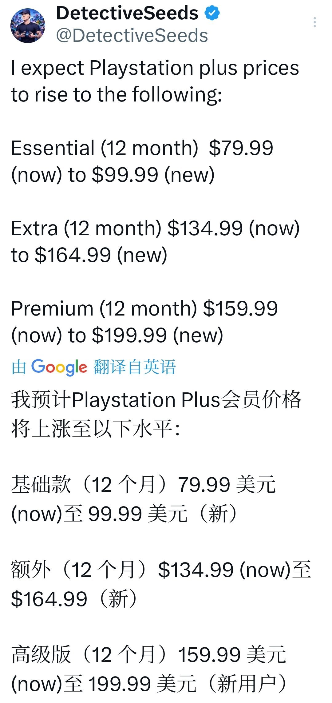 除了硬件,玩家最關心的就是訂閱服務是否跟進。“DetectiveSeeds”近日在網上發佈預測,稱PS Plus年度訂閱各檔位可能迎來明顯上調,與硬件漲價邏輯一致,屬於索尼“軟件與服務”收入補缺口的常見策略:Essential一檔:12個月從79.99美元漲至99.99美元,漲幅約25%。Extra二檔:從134.99美元漲至164.99美元,漲幅約22%。Premium三檔:從159.99美元漲至199.99美元漲幅約25%。目前這仍是“預測”,索尼尚未正式公告。但結合索尼此前多次通過PS Plus調整價格,以及硬件漲價後“硬件不賺錢、靠服務補”的商業模式,這一傳聞被廣泛討論。