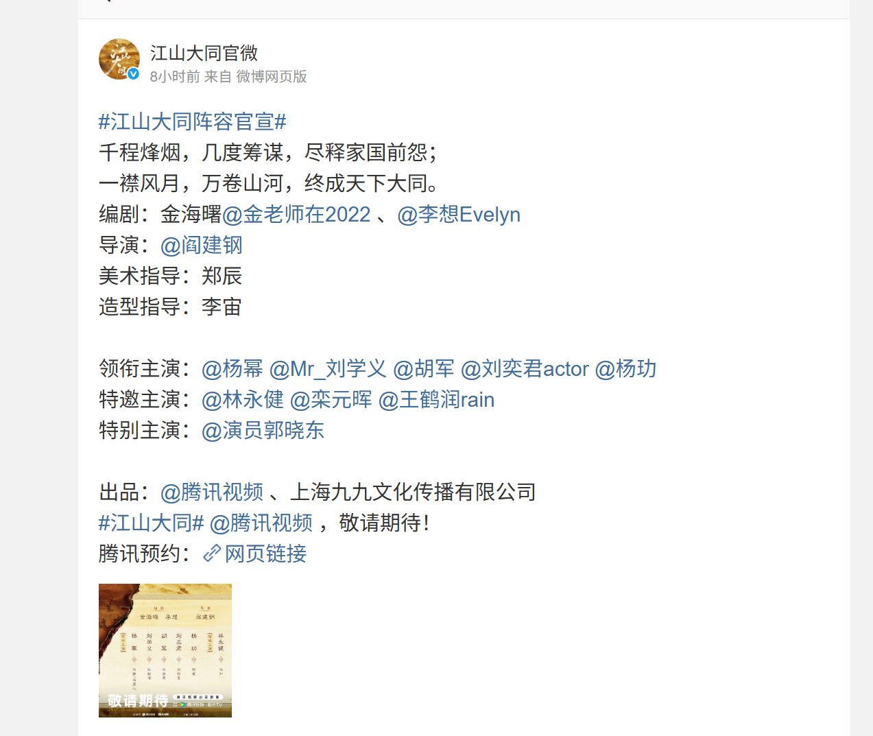 官方釋出的宣傳文案“千程烽煙,幾度籌謀……終成天下大同”也進一步暗示劇情將圍繞權謀博弈、家國命運與人物抉擇展開。網傳4月初開機,快的話端午節前就能拍攝完畢。
