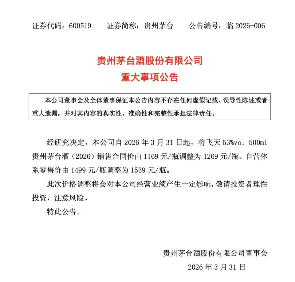 3月30日晚,贵州茅台发布重大事项公告,宣布自2026年3月31日起,飞天53%vol 500ml贵州茅台酒(2026)销售合同价由1169元/瓶调整为1269元/瓶,自营体系零售价由1499元/瓶调整为1539元/瓶。这是茅台继2023年11月上调出厂价后,再次对核心产品价格进行调整。