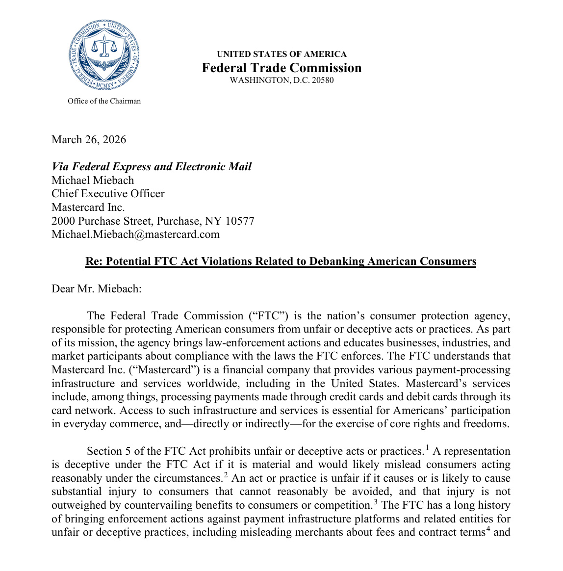 美國聯邦貿易委員會(FTC)主席 Andrew Ferguson 向 Mastercard、Visa、PayPal 和 Stripe 的首席執行官發出警告信。