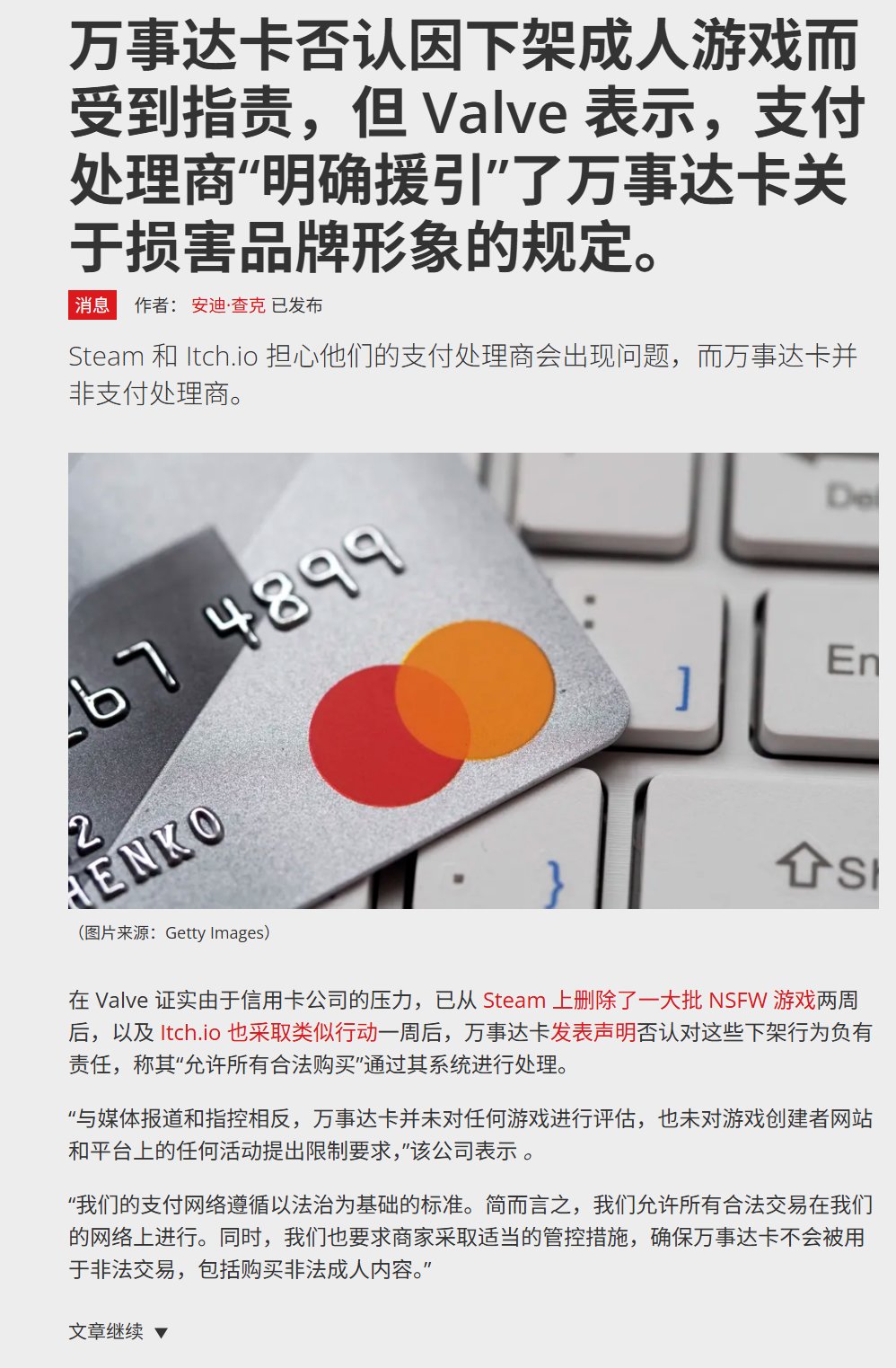 據悉,2025年,Valve 曾透露 Mastercard 施壓要求 Steam 移除多款成人(NSFW)遊戲。雖然 Mastercard 當時辯稱並未直接干預,但支付處理器因執行 Mastercard 關於“損害品牌形象交易”的規定,迫使大量獨立遊戲及成人遊戲開發者陷入困境。