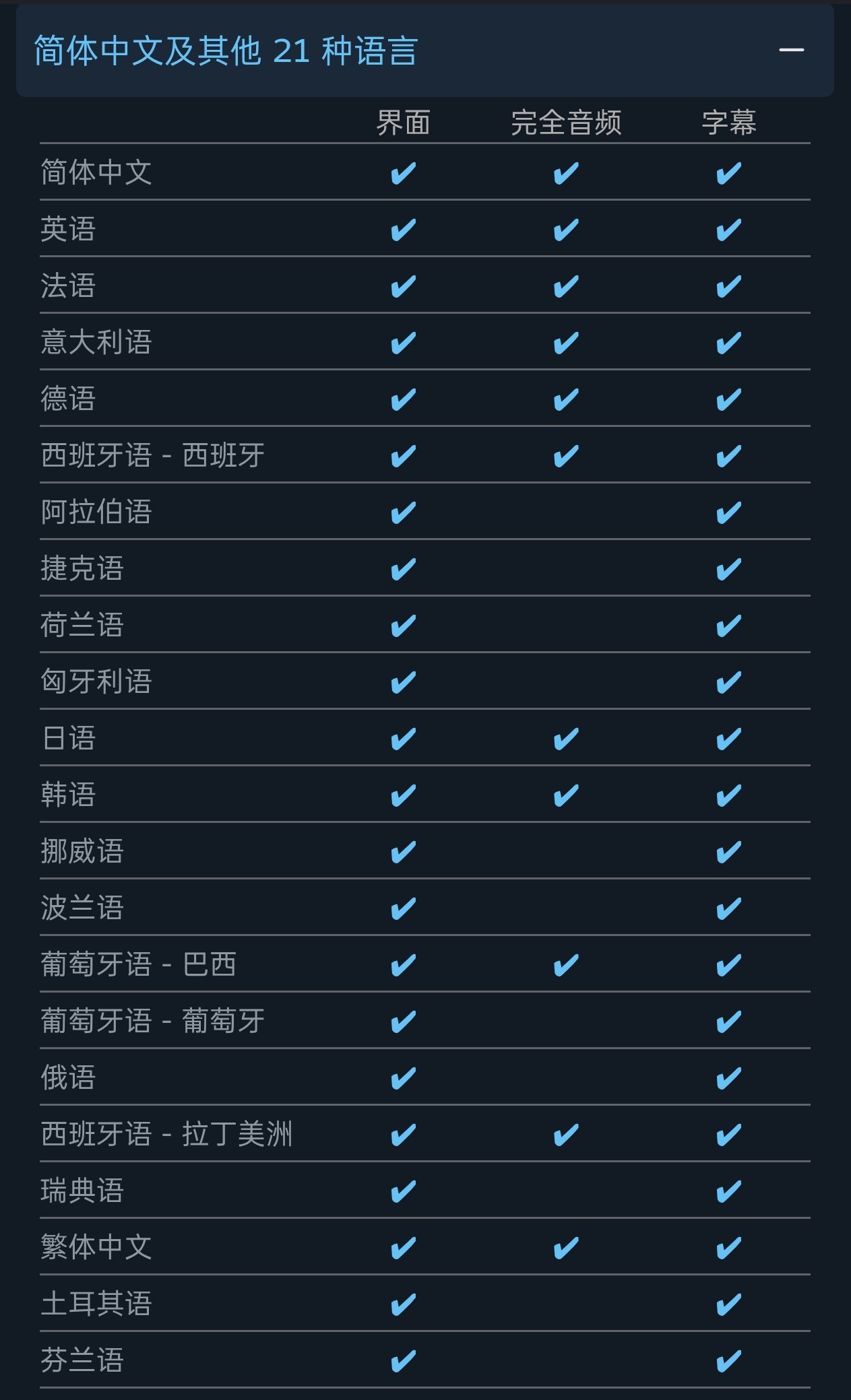 从Steam页面截图可见,简体中文已实现界面、完全音频、字幕三项全支持,与英语、法语、德语等主流语言并列,彻底消除”11国配音无中配“现象,消除国内玩家语言壁垒,让玩家能沉浸式体验游戏剧情与战斗氛围。