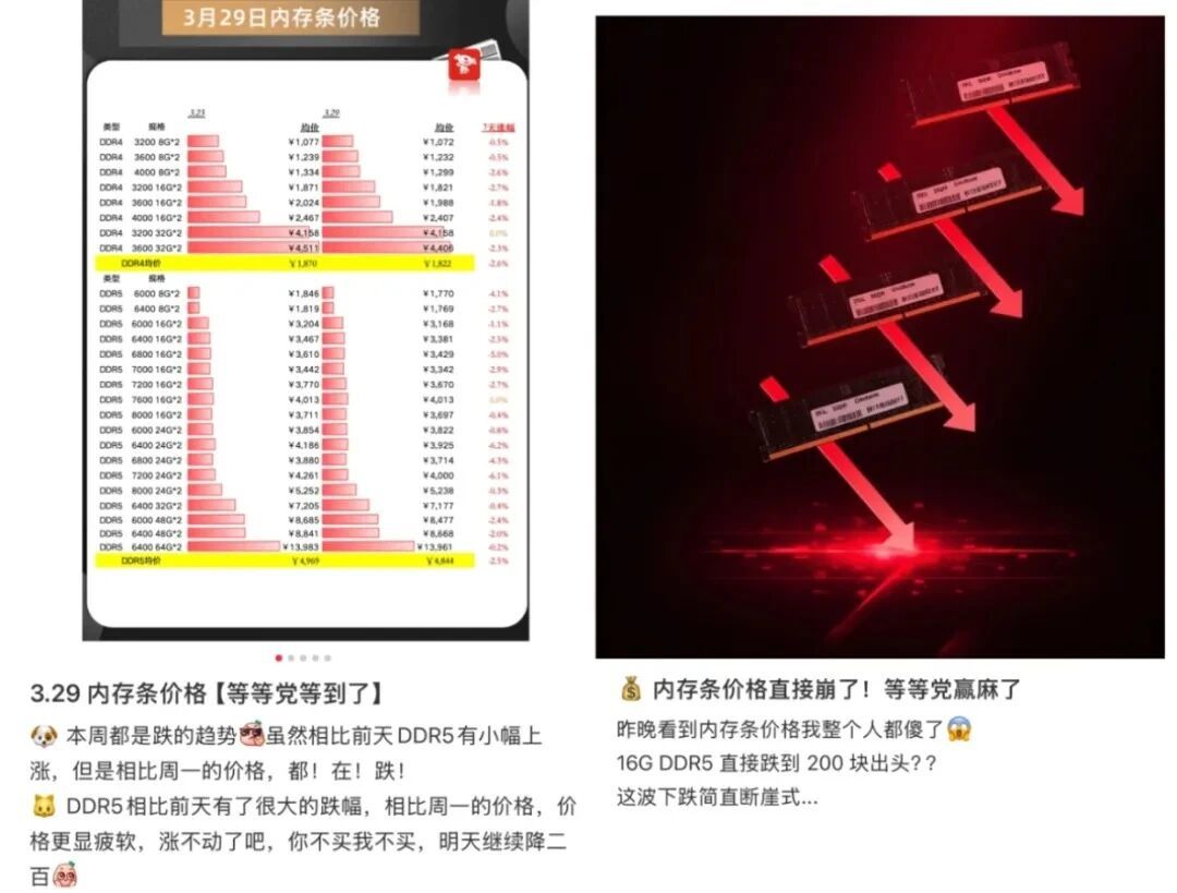 2026 年 3 月下旬,国内内存条市场结束此前的涨价周期,迎来价格断崖式下跌,DDR4、DDR5 全系列产品价格大幅回落,尽管经销商出货意愿强烈,但终端市场承接乏力,行业供需格局迎来显著变化。