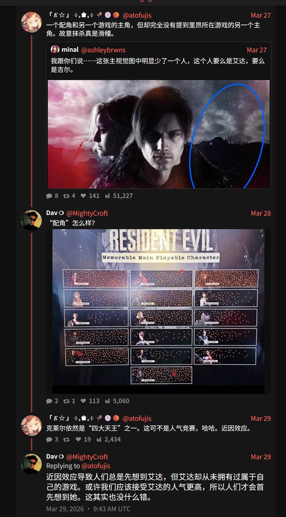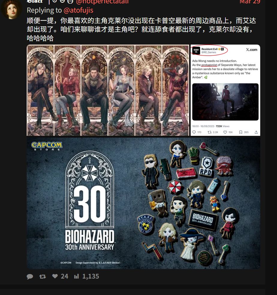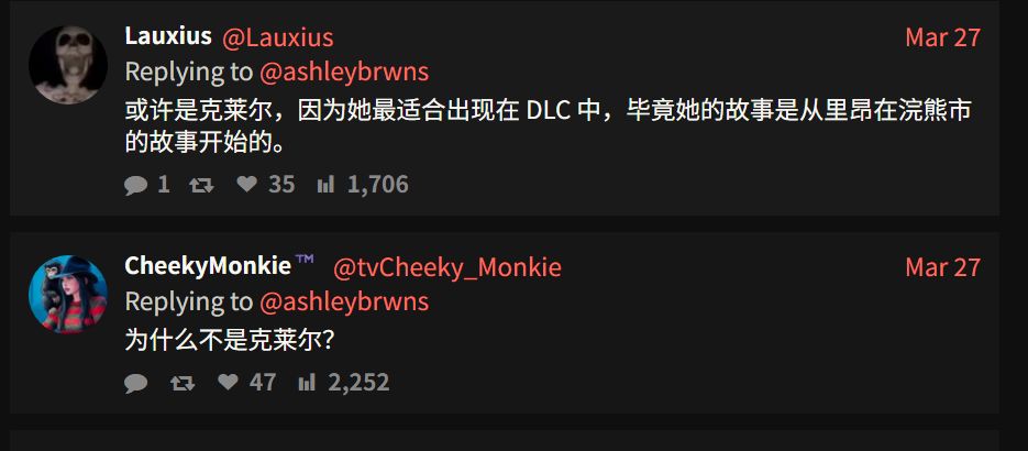 經後續發言可知,該用戶,力挺克萊爾,而不是艾達,隨後另一位向他指出艾達曾被官方海報中列爲主要可玩角色。