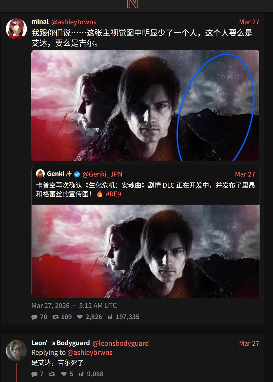 起因是卡普空官宣,生化危機9劇情DLC正在開發中,並伴隨着一張里昂和格蕾絲的合影,而這張合影,左爲格蕾絲,中間C位爲里昂,而在圖片右側,留有大量空白,而就此,有玩家分享了之間的看法,應該是會增加一個角色,對此有玩家猜測是吉爾或者艾達。