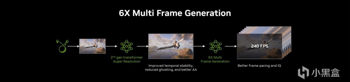 同時,英偉達爲適配遊戲新增6 倍多幀生成模式。開啓後,顯卡每渲染 1 幀原生畫面,就能通過 AI 額外生成 5 幀補幀畫面。