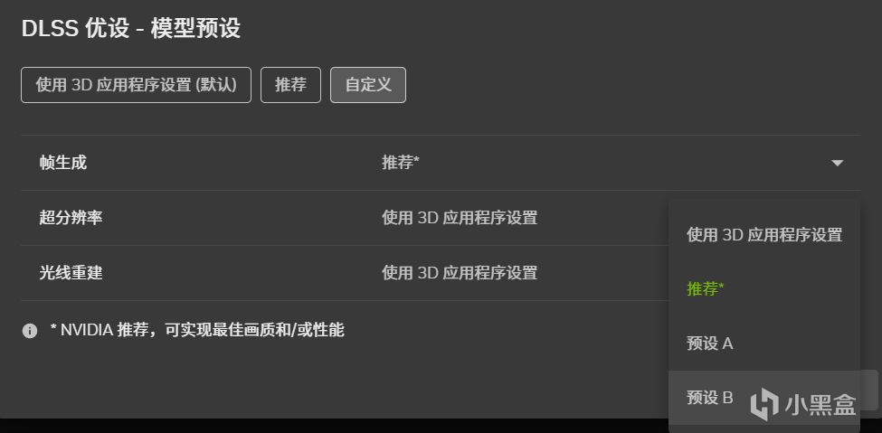 要在支持的遊戲中激活新模型,請打開“DLSS 優設 - 模型預設”,在全局或針對特定遊戲進行設置,單擊“幀生成”下拉菜單,然後選擇“Preset B”。
