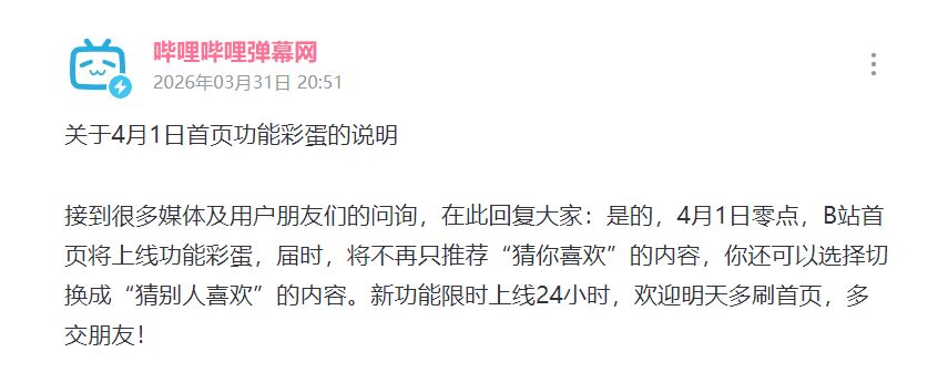 B站宣布4月1日0点起,首页将上线24小时的全新功能彩蛋“猜别人喜欢”。