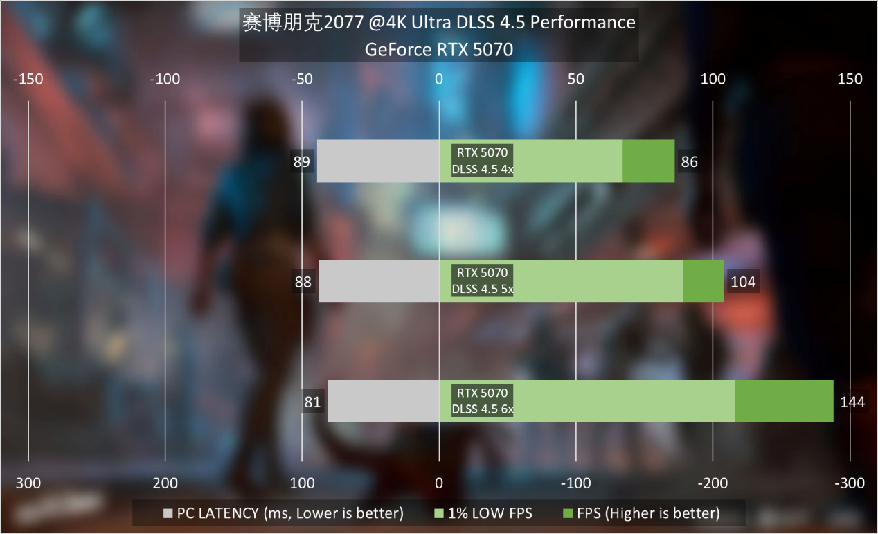 在《賽博朋克2077》中開啓光線追蹤超速模式4K最高畫質作爲參考。照理說GeForce RTX 5070是沒辦法在這個模式下流暢運行的,開啓DLSS 4.5性能模式之後,4X動態多幀生成可以做到86FPS,6X多幀生成模式可以做到144FPS。