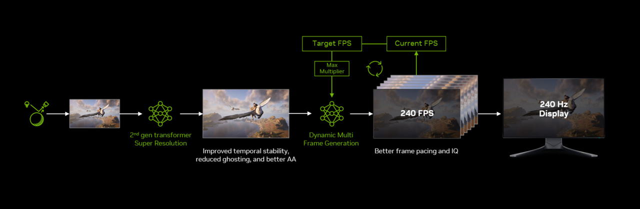 舉個例子。如果遊戲原始幀率爲80FPS,顯示器有240Hz。那麼DLSS 4.5動態幀生成會自動調節成3X多幀生成,通過80×3=240FPS來喫滿顯示器刷新率。當遊戲場景變得更爲複雜,遊戲原始幀率降低到60FPS,動態幀生成則會提升至4X,即60×4=240FPS。