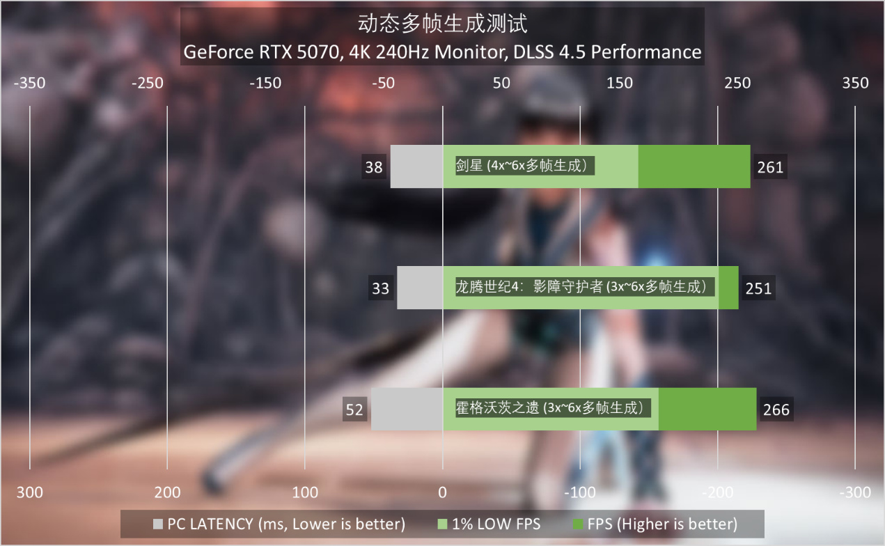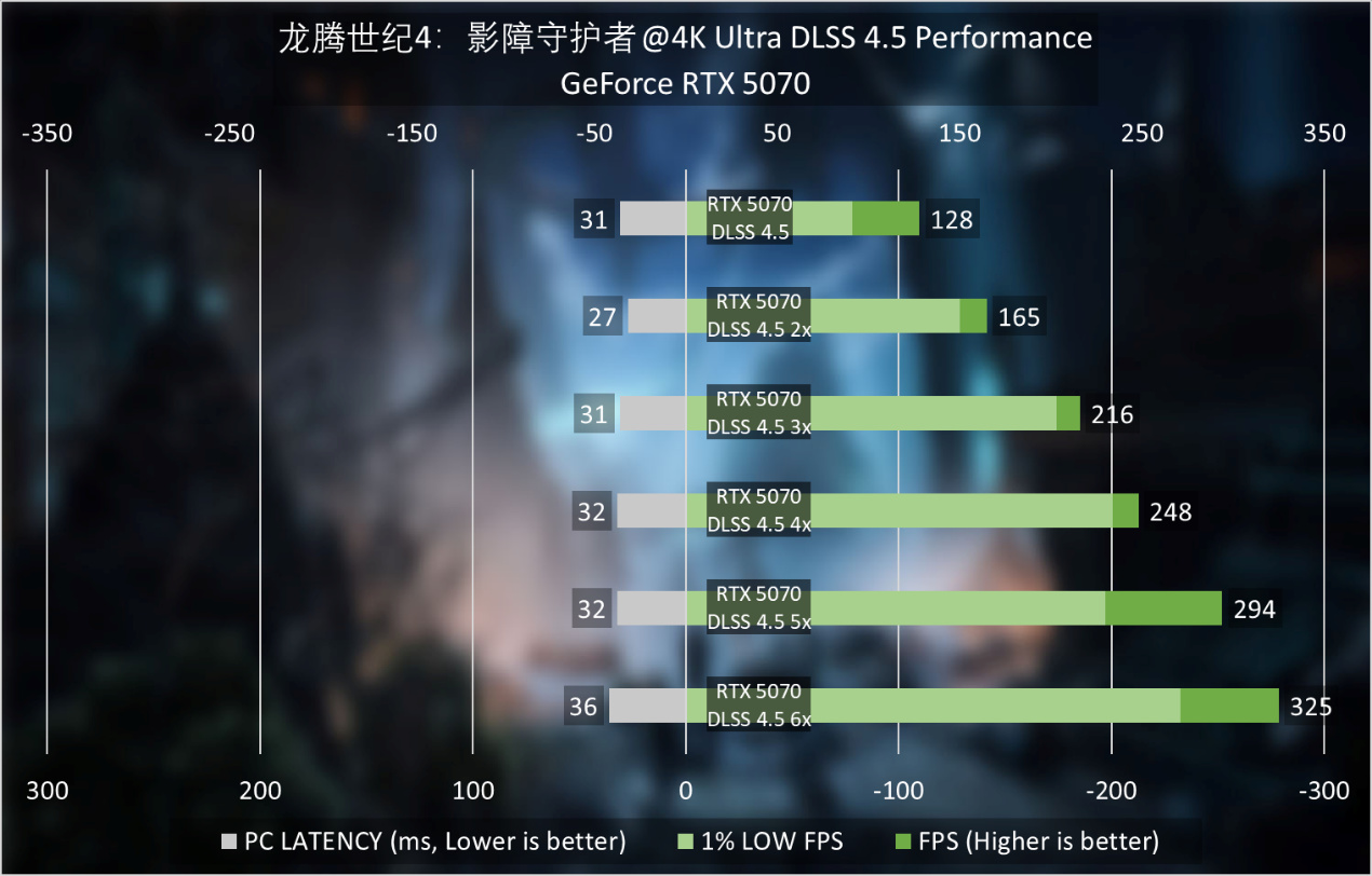 《龍騰世紀4:影障守護者》4K最高畫質在4X多幀生成以上,GeForce RTX 5070就能餵飽4K 240Hz刷新率,6X同樣是遊刃有餘。