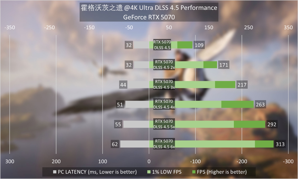 《霍格沃茨之遺》4K最高畫質在DLSS 4.5性能模式下,6X多幀生成可以做到313FPS的表現,GeForce RTX 5070在3X幀生成以上就已經能夠很好地利用4K 240Hz顯示器的性能,同時較低的延遲也確保了遊戲的流暢度。