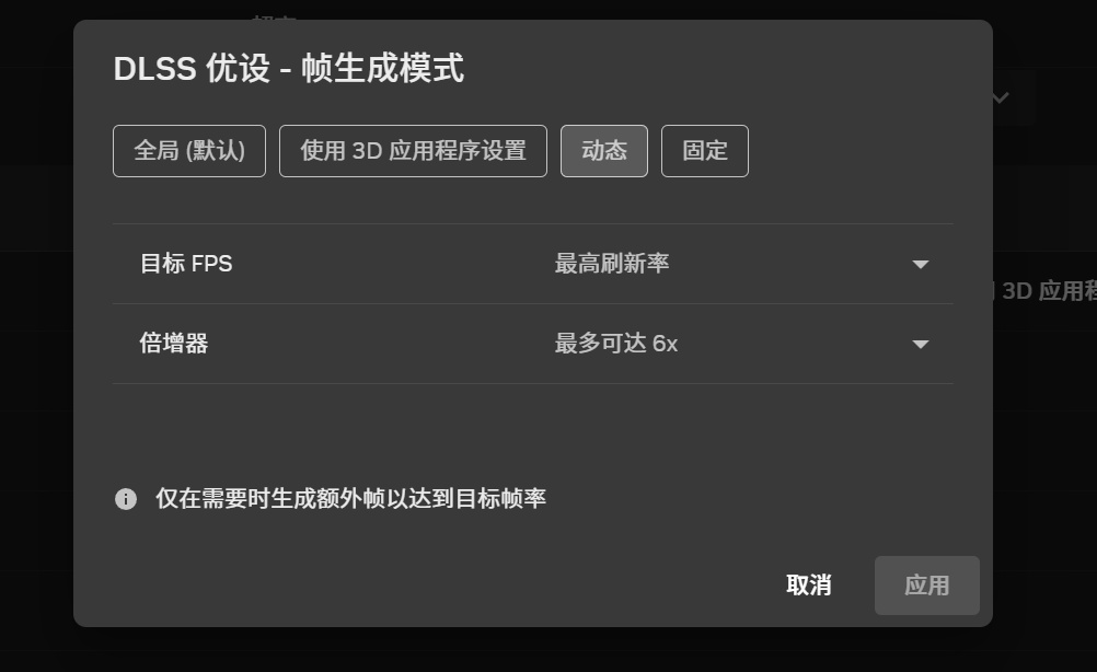 開啓6X多幀生成和動態多幀生成,需要Game Ready驅動更新至595.79,NVIDIA App測試版更新至最新。先通過NVIDIA 優設功能將對應的遊戲設置成動態模式,設置目標FPS爲最大刷新率,倍數選擇最多可達6X。