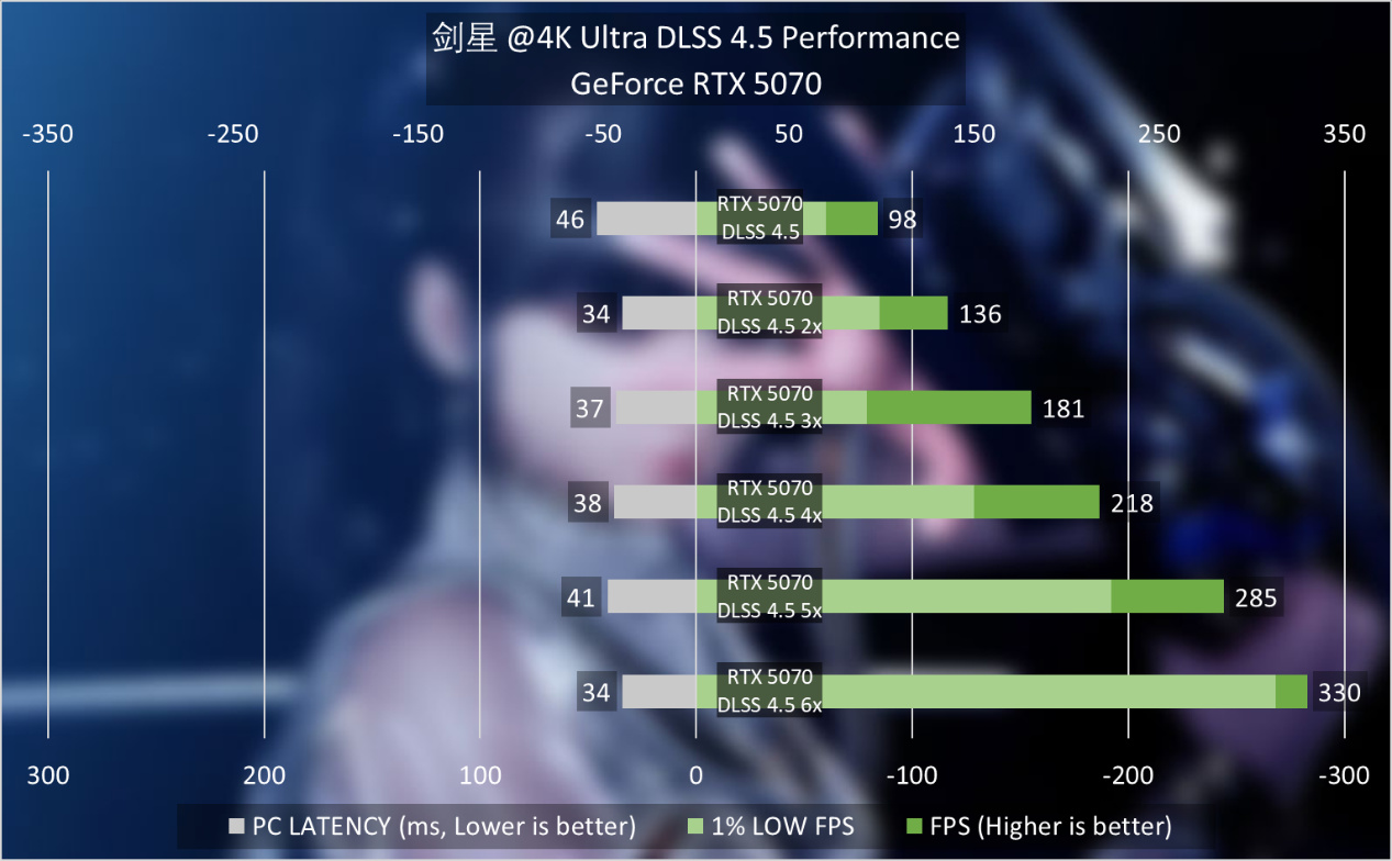 對於玩家而言,其實不需要藉助額外工具,通過NVIDIA App,就可以直接觀測到動態幀生成的狀態。比如下圖《劍星》中,筆者將目標FPS設定成500FPS,也能直接激發DLSS 4.5動態多幀生成,最高達到6X,讓GeForce RTX 5070在4K最高畫質且開啓光線追蹤的前提下,完成330FPS左右的表現。