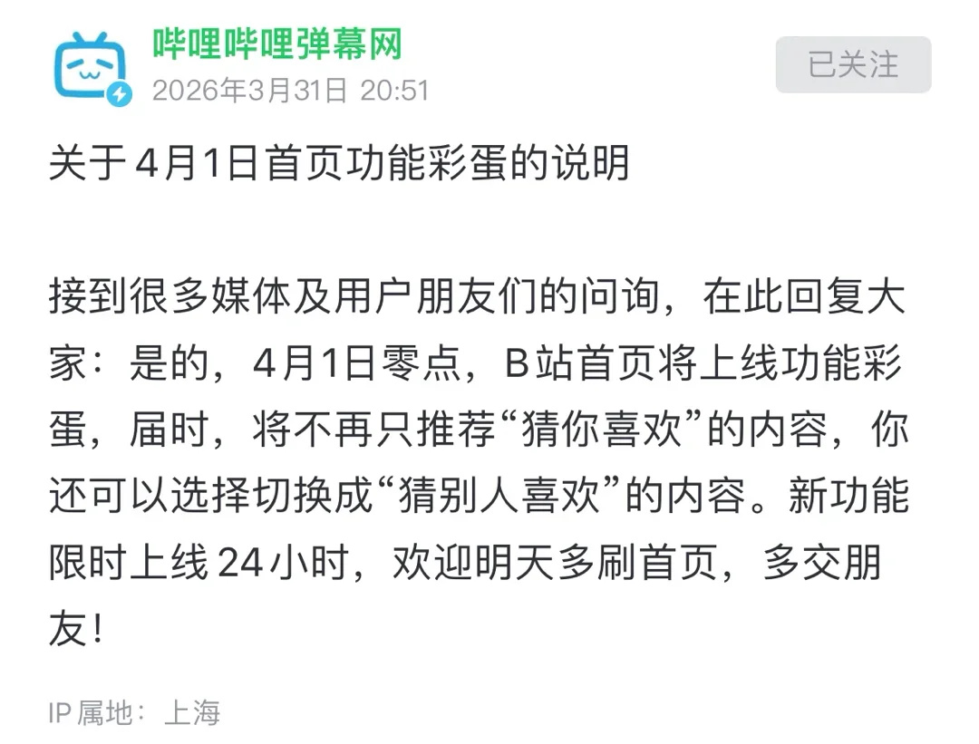 就在猜测声愈演愈烈之际,B站官方正式发布说明,证实此次“下线猜你喜欢”并非真正的功能调整,而是专为4月1日打造的限时24小时彩蛋。