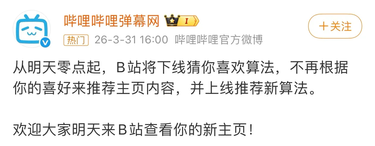这场愚人节彩蛋要追溯到3月31日,B站官方突然发布公告,宣称自4月1日零点起,将正式下线首页核心的“猜你喜欢”推荐算法,不再依据用户喜好进行个性化内容推送,同步上线全新推荐机制。