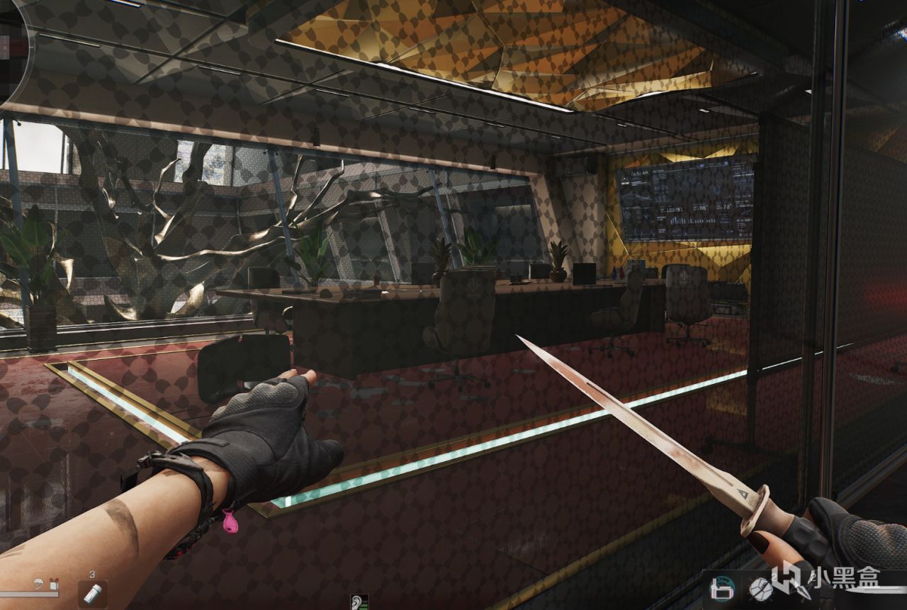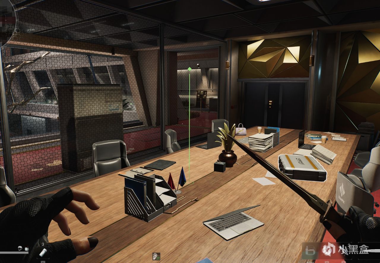 从刚才说的滑索直接就上到顶层了,旁边就是总裁室了。建议在总裁室外看一眼有没有刷再开。两个总裁桌上都可以刷。