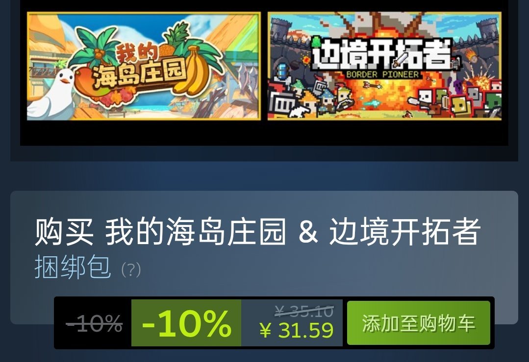 如果有捆绑包的其中一个游戏,《我的海岛庄园》-10%折扣,也就是31.59元