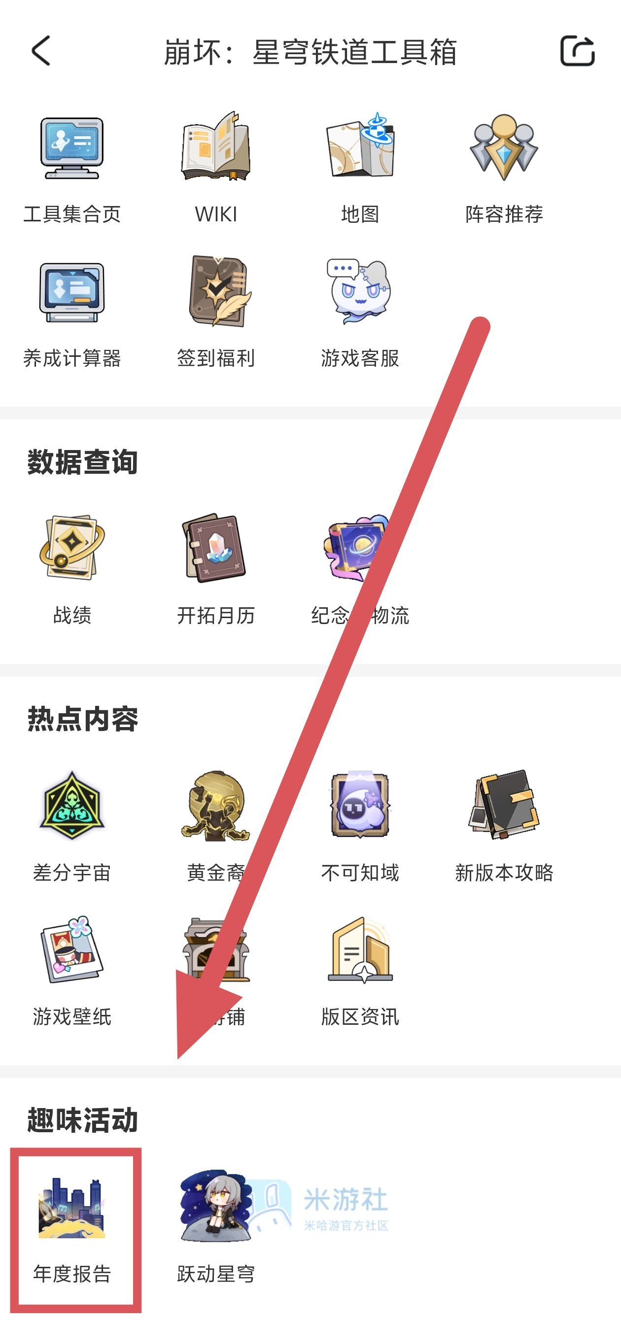 打开米游社APP → 找到崩坏:星穹铁道区 → 进入工具箱 → 打开年度报告