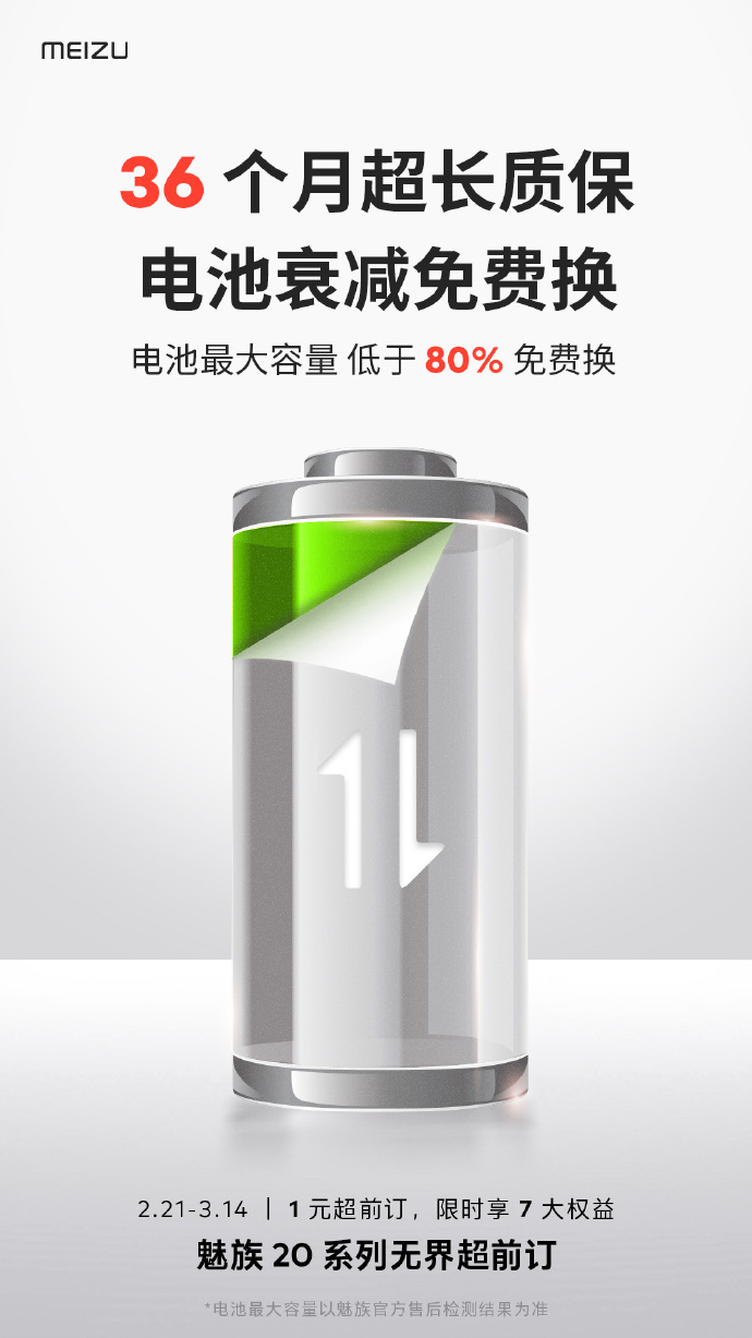 目前,魅族 20 系列已开启“ 1 元超前预订”活动,预订后可享 36 个月超长质保等 7 大权益(IT之家注:活动时间为 2 月 21 日至 3 月 14 日)。最新预热信息显示,魅族 20 系列 36 个月超长质保可享“36 个月内电池最大容量低于 80% 免费换”。