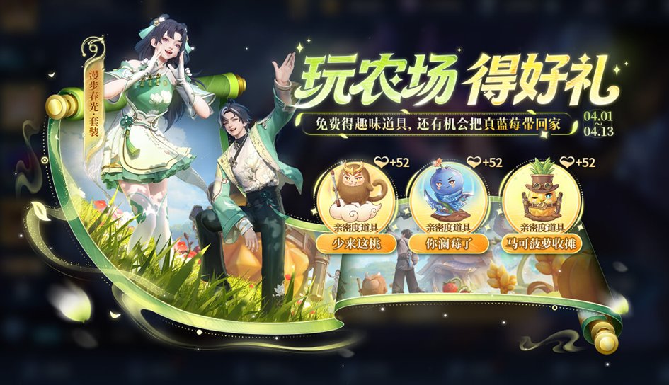物品有【次元套裝-漫步春光】、【親密度道具-你瀾莓了】、【親密度道具-少來這桃】、【親密度道具-馬可菠蘿收攤】