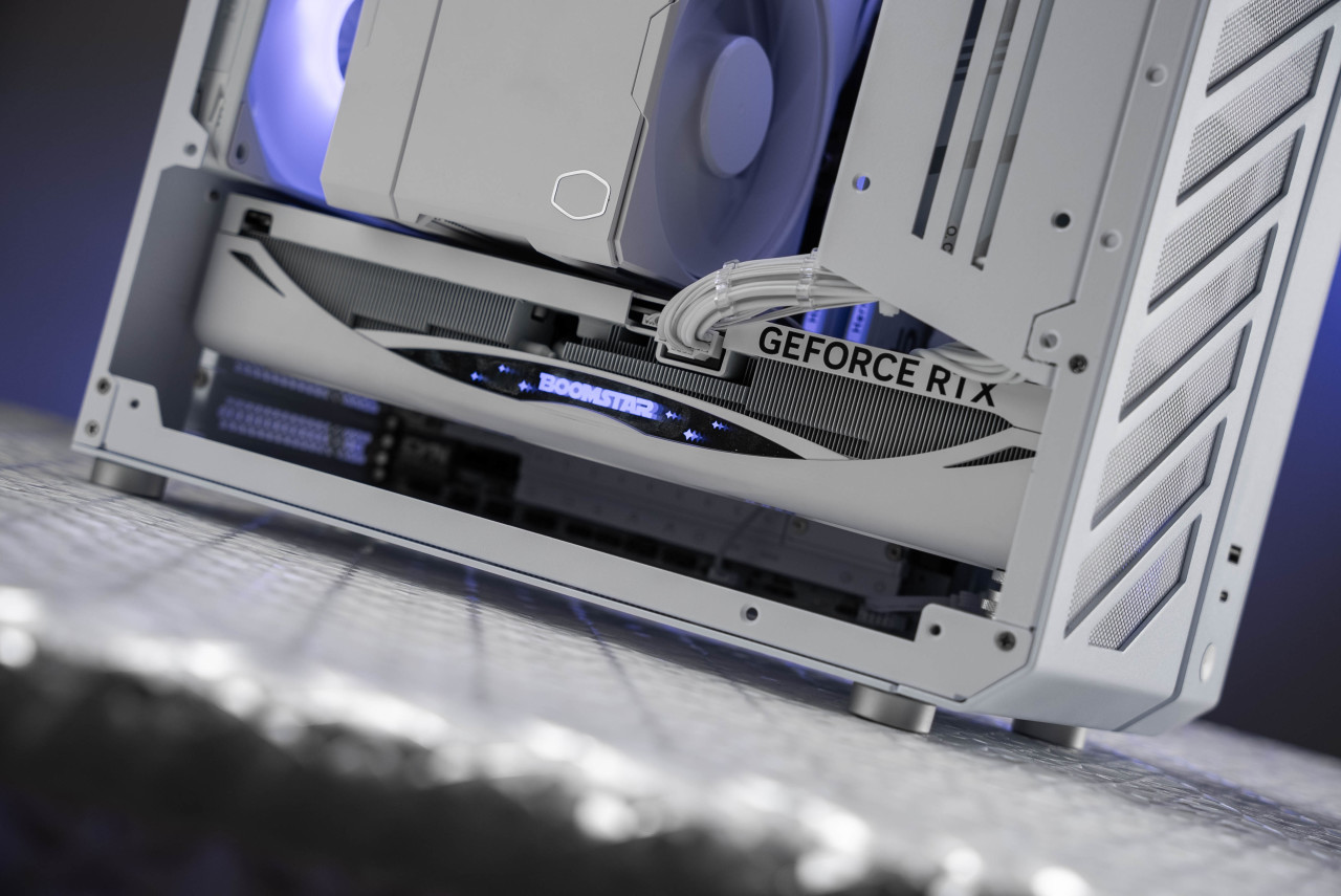 那麼就來分享一下本套的搭配,因爲顯卡和內存是粉絲另外自備,所以拍照的時候用了一張同樣擁有着非常高顏值的白色顯卡——影馳5070星耀,代替一下,作爲亮機卡使用,而這張卡的長度恰好爲335mm,可以最完美地塞進這個C28的機箱裏面