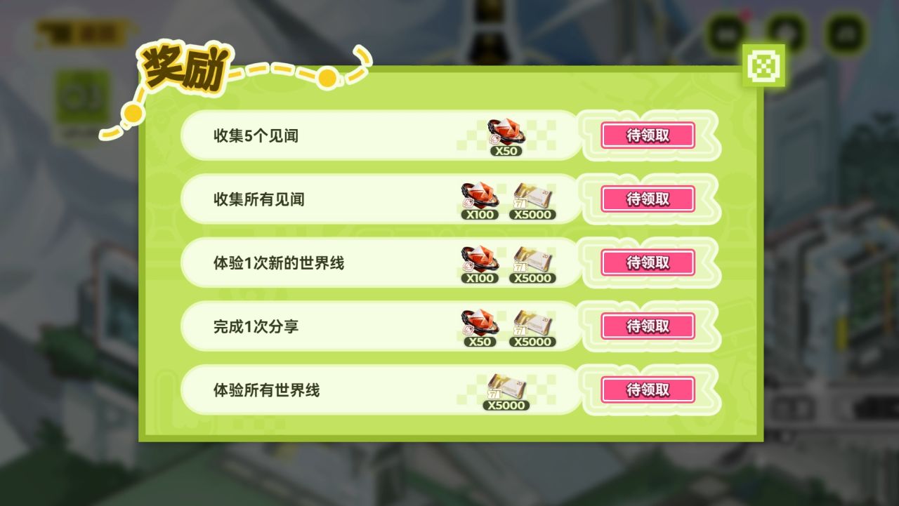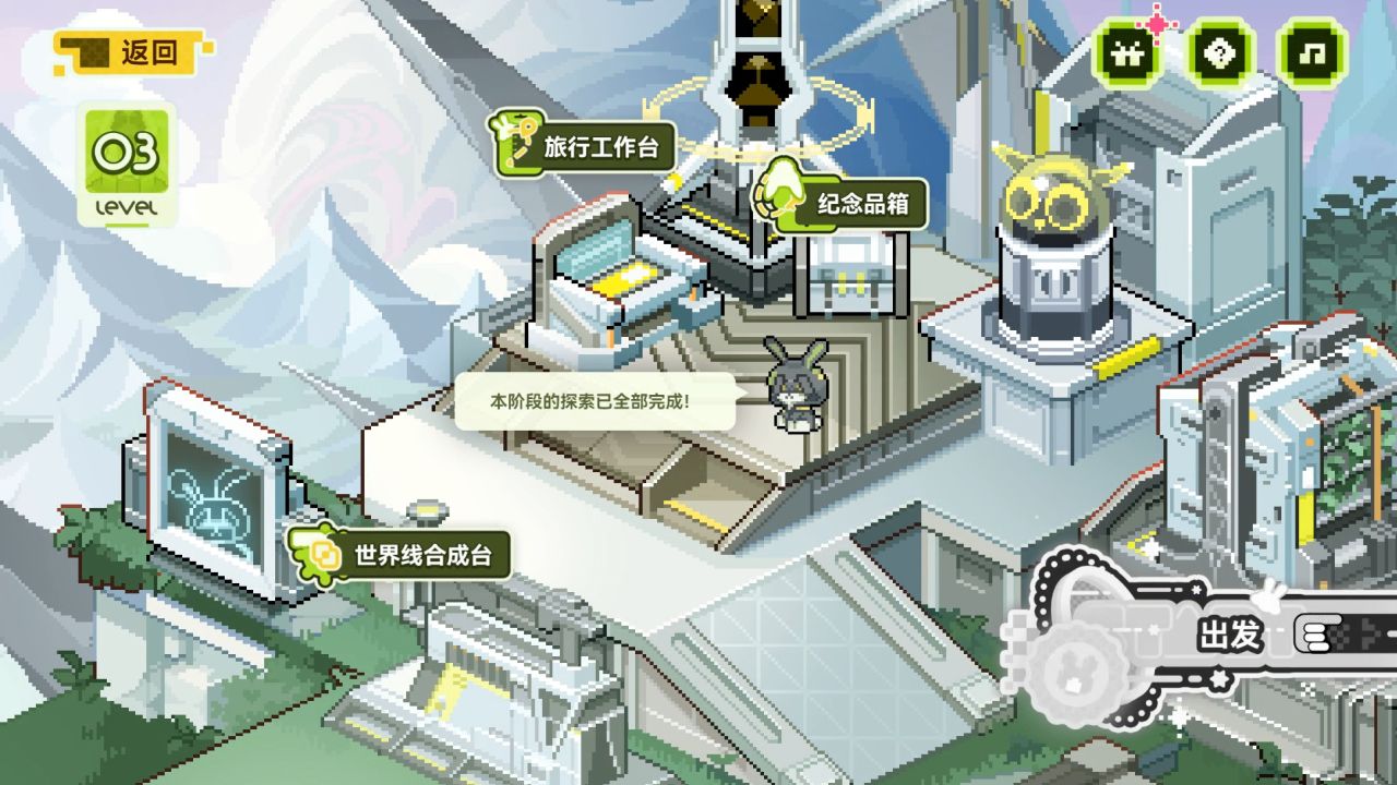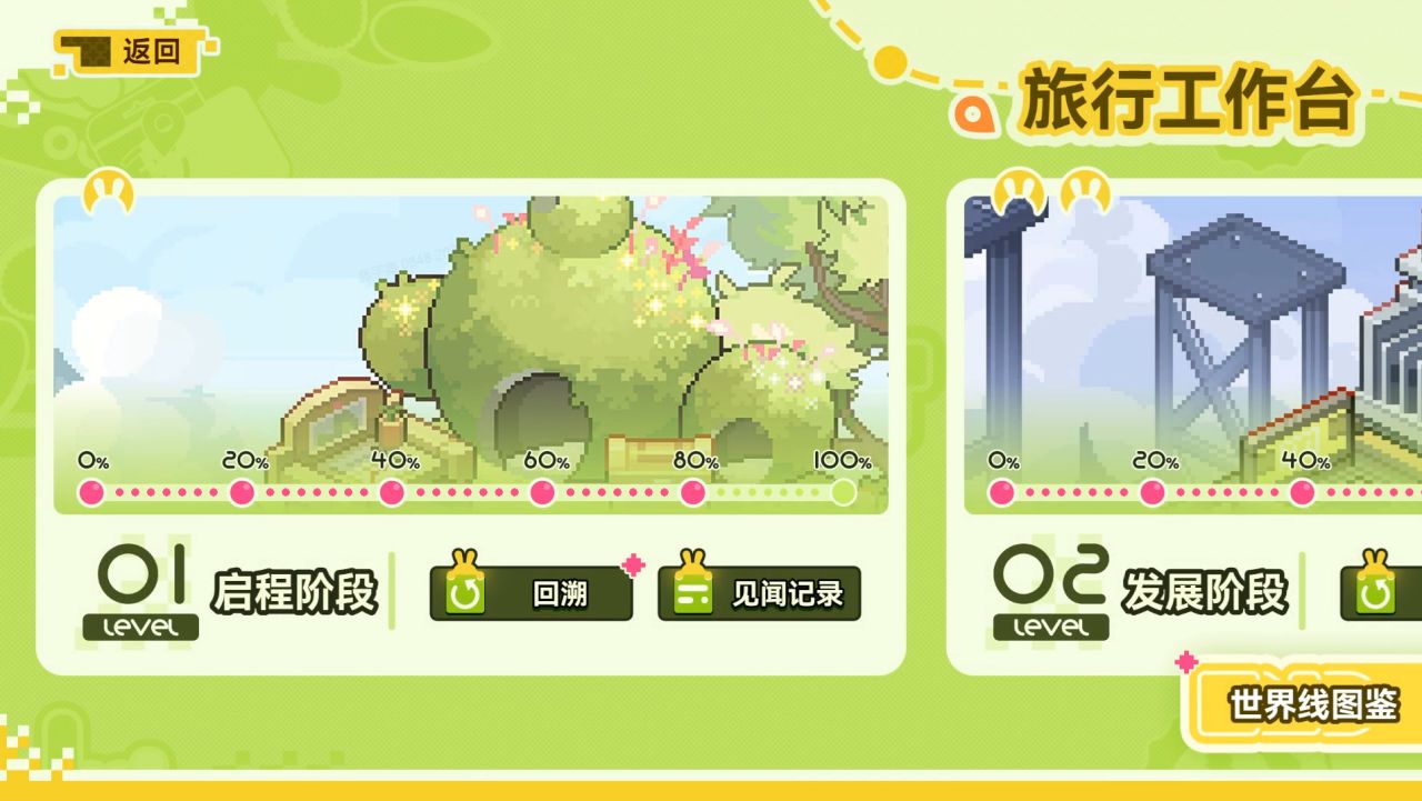 此時會提示本階段探索已經全部完成,點擊世界線合成臺,隨便找點合成,我選擇了以上幾個合成。獲得了綻放圖鑑,之後去旅行工作臺點擊回溯,再點主界面的出發,把之前沒收集到的道具全收集。