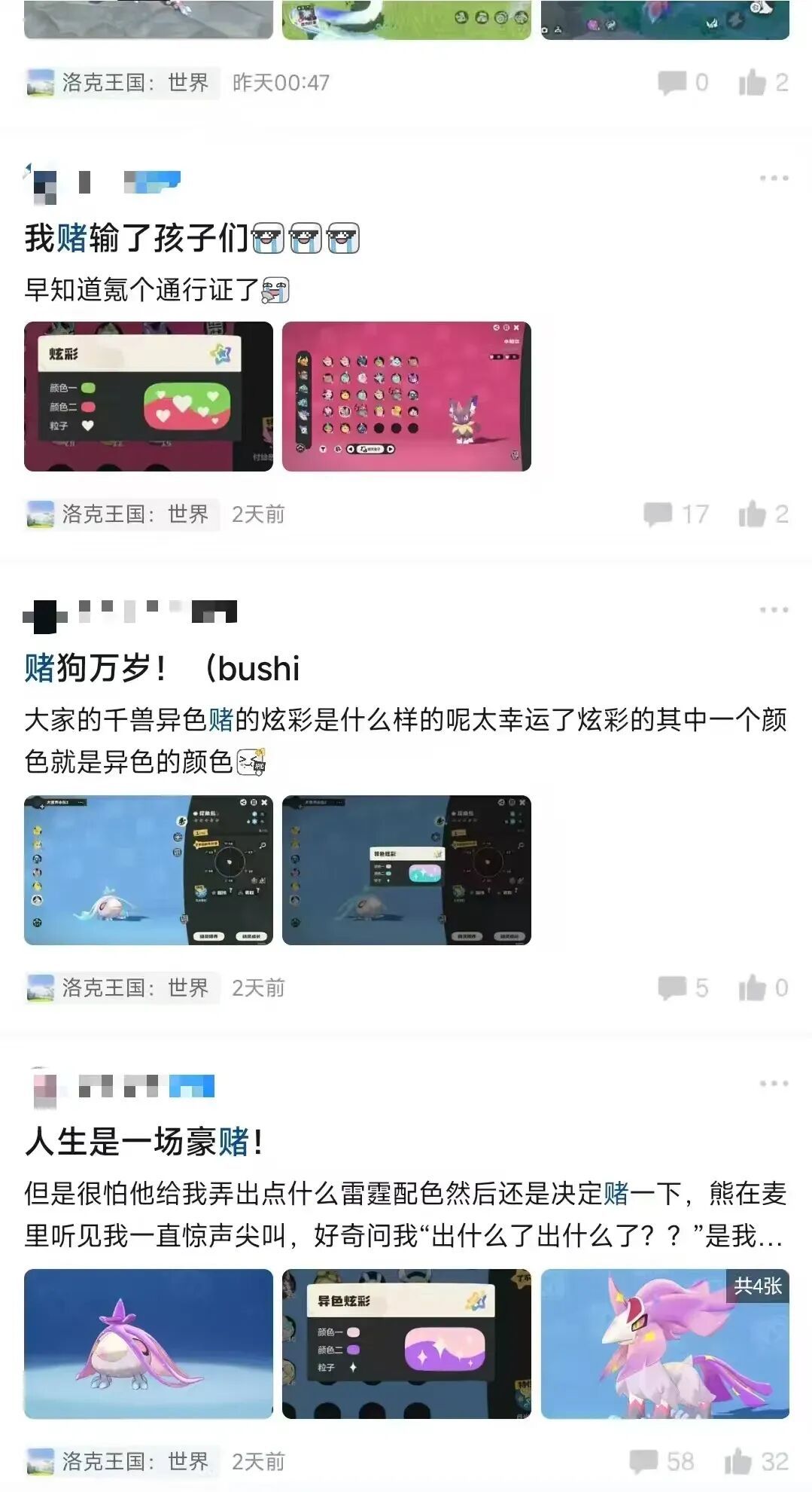 由于棱镜球属于珍贵资源,几乎只能依靠氪金获取,且捕捉后精灵的炫彩配色是随机的,黑白炫彩配色更是本赛季的限定配色,因此,对于追求给自己喜爱的精灵赌一个合适且漂亮的炫彩外观的玩家们来说,个中投入的金钱成本便颇有深度了。社区中不乏玩家们“赌球”成功或失败后的碎碎念,俨然化身成为了大型“赛博赌场”。