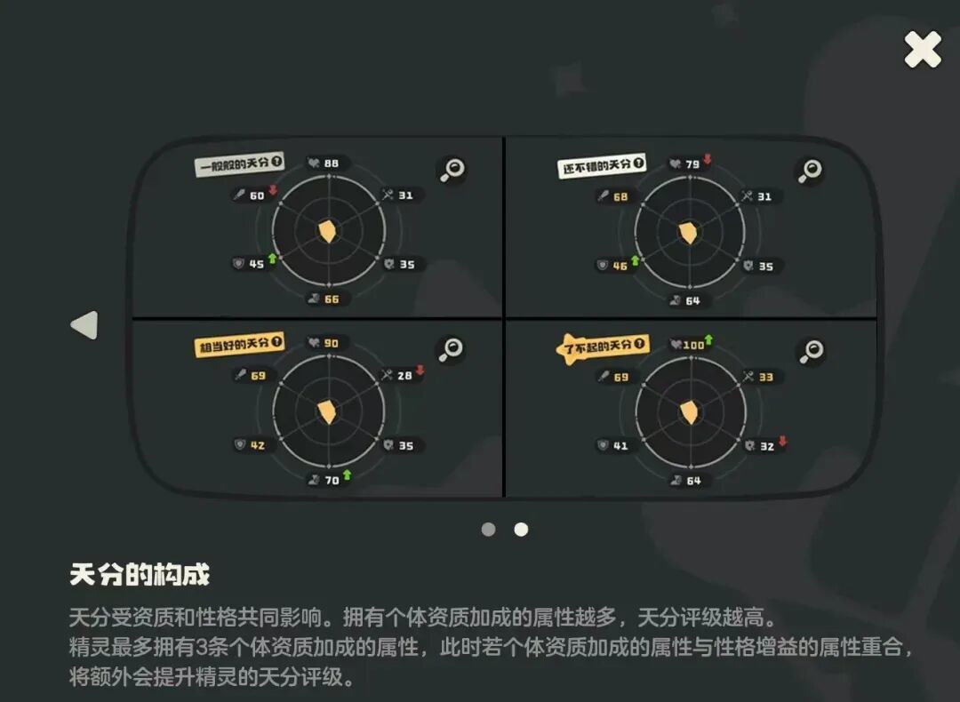然后是天分。在捕捉到精灵后,系统会随机在精灵的六维属性之中进行加点,如果加的属性比较少,那精灵的资质便是“一般般的天分”。相反,如果在六维属性中有三条属性给到了加点,且正好与性格增益的属性一致,那就是“了不起的天分”。