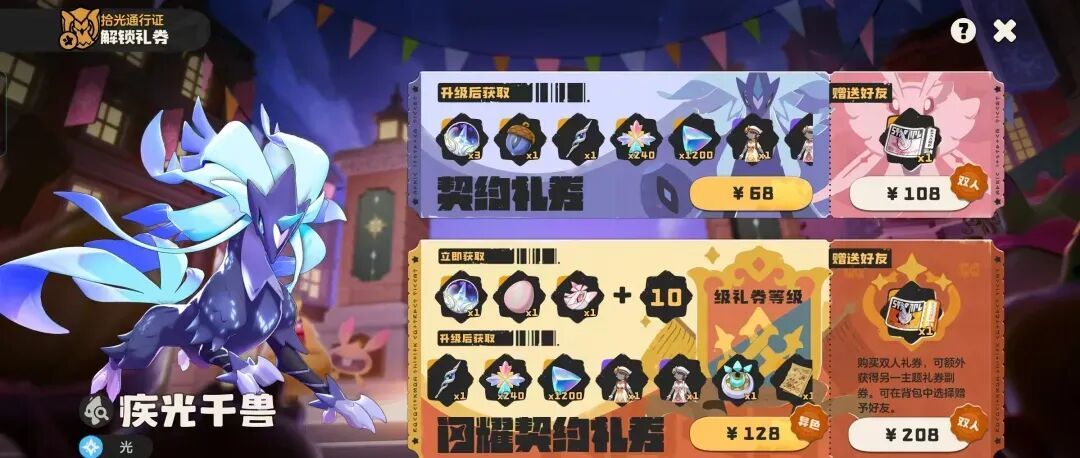 其次,便是现今几乎所有网游的标配——月卡和通行证系统。《洛克王国:世界》的月卡比较简单,只是给到一些特殊货币与物品合成材料,而通行证的内容需要特别提及的,就是购买通行证后赠送的限定精灵了。如在本期通行证中,便提供了“绒仙子”和“疾光千兽”两种选择。