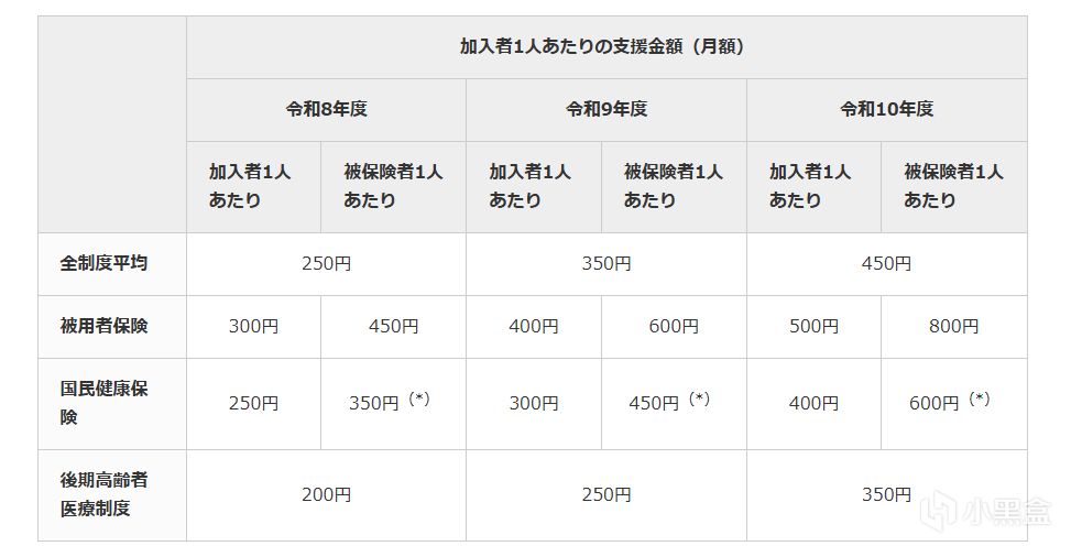 翻譯:從所有健康保險計劃的平均金額來看,預計 2026 財年每位健康保險參保人的每月負擔爲 250 日元(每年 3,000 日元),2027 財年爲 350 日元(每年 4,200 日元),2028 財年爲 450 日元(每年 5,400 日元)。