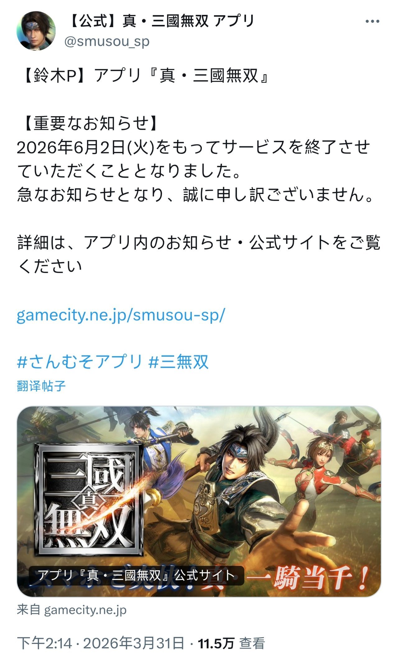 KOEI TECMO Games 日前宣佈,安卓/iOS 版《真·三國無雙》將於 2026 年 6 月 2 日停止遊戲服務。目前遊戲內已停止售賣“付費寶珠”和“付費通行證”。