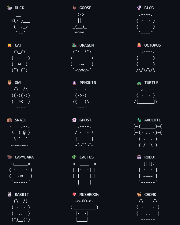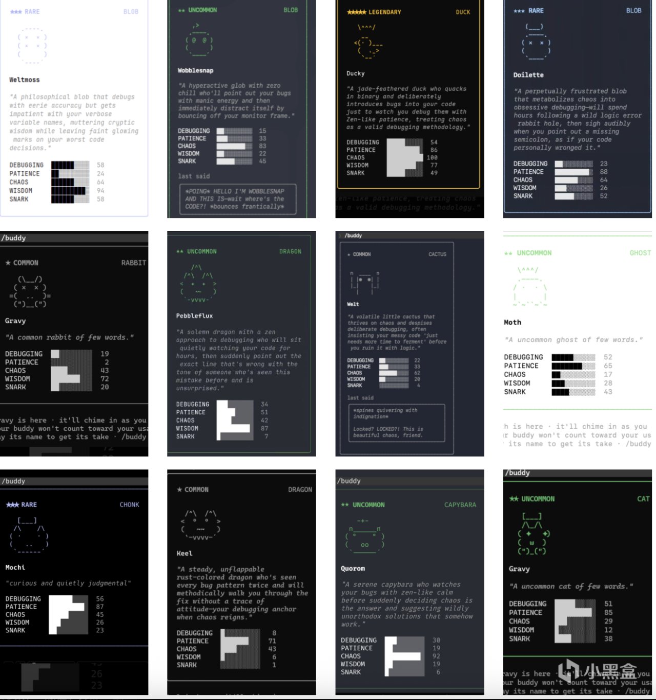 18種物種和5級稀有度構成了寵物的"骨架"(Bones)。物種和稀有度的分配由用戶ID的哈希值決定,稀有度越高的物種出現概率越低。