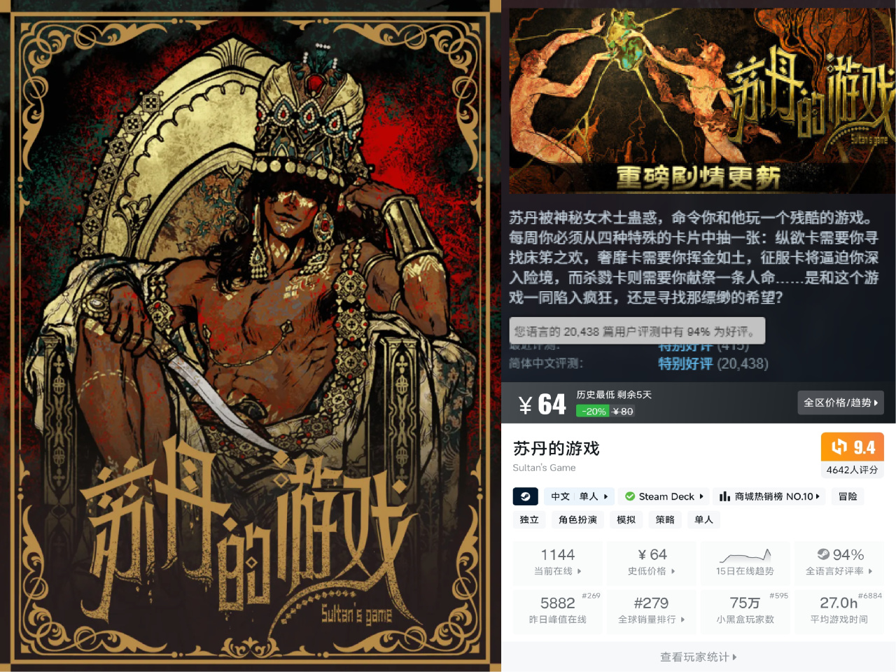 無論設定多麼獵奇、玩法多麼大尺度,劇情纔是這款文字遊戲的核心魅力所在。從發售初140萬字到一週年大更後390萬字,《蘇丹的遊戲》一年爆更250萬字,遊戲文本量翻了近3倍。一次次經歷道德的挑戰,直麪人性的醜惡,我們才能寫出屬於自己的“一千零一夜”。