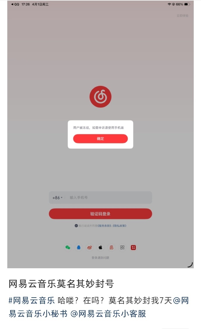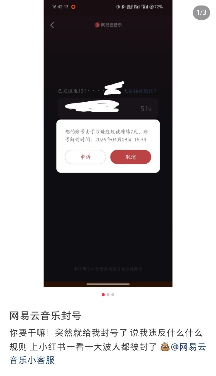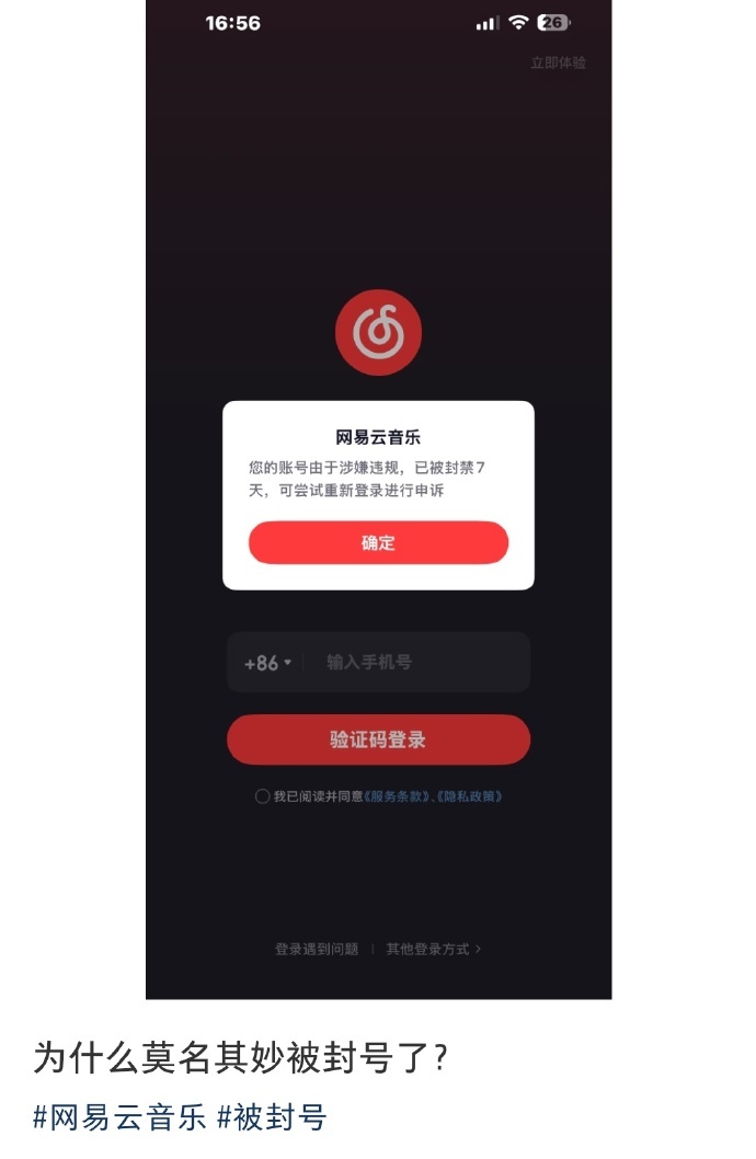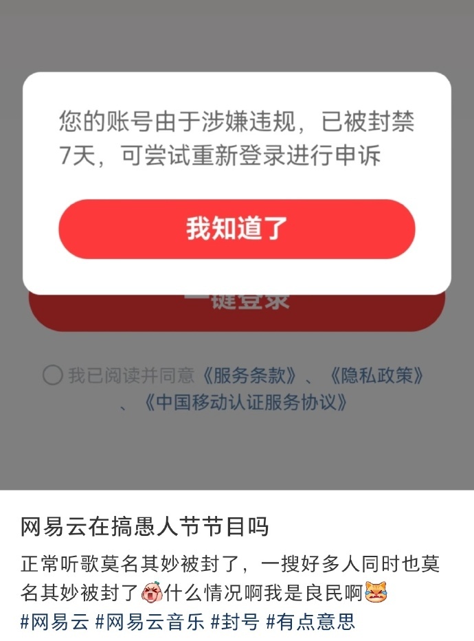4 月 1 日下午 5 點左右,無數網易雲音樂用戶正準備點開收藏歌單放鬆心情,卻被屏幕上的彈窗狠狠澆了一盆冷水。賬號涉嫌違規,已被封禁 7 天的紅色提示突然彈出,讓所有人都懵了。這到底是愚人節的整蠱玩笑,還是平臺真的出了大事?全網瞬間炸開鍋,大家一邊瘋狂截圖發社交平臺吐槽,一邊焦急等待官方給出說法。