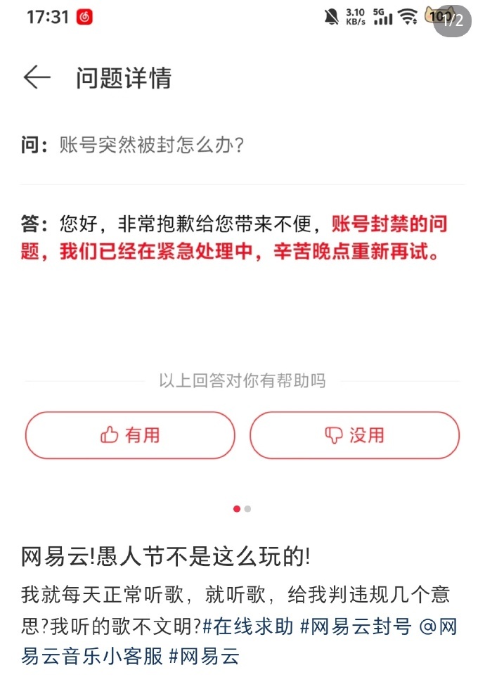 直到傍晚時分,網易雲官方纔終於通過客服渠道給出回應,承認這不是愚人節玩笑,而是系統出現短時間異常,導致部分用戶被誤封。官方表示技術團隊已經緊急修復問題,讓受影響的用戶重新登錄嘗試恢復。一句簡單的系統異常和抱歉,雖然暫時平息了大家的恐慌,但沒能完全消解不滿,畢竟這場突如其來的封號風波,實實在在影響了太多人的使用體驗。