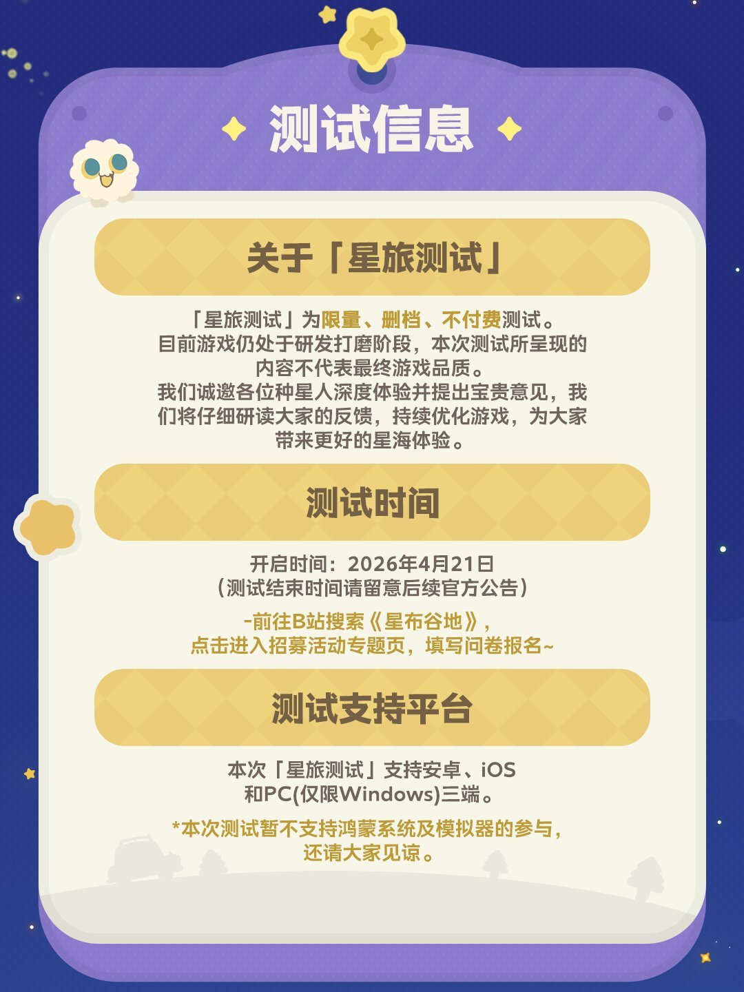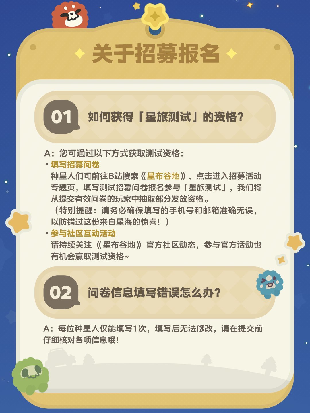 在B站搜索“星布穀地”點擊活動頁面,填寫「星旅測試」招募問卷,完整填寫併成功提交問卷,即視爲報名成功,將有機會獲得測試資格。