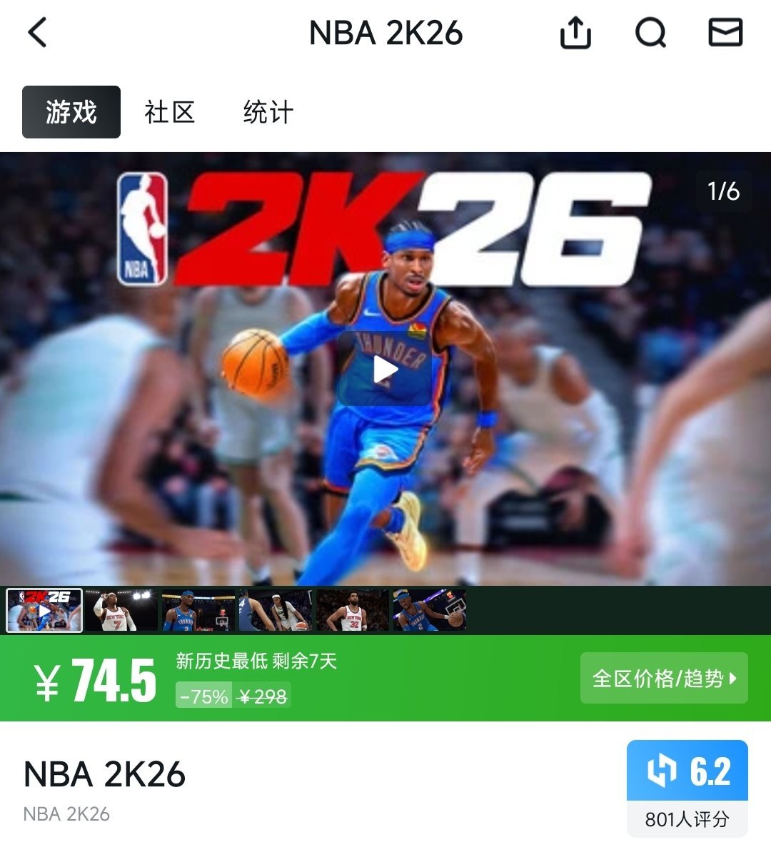 原價298元,折後僅需74.5元,新歷史最低價,剩餘優惠7天。作爲2026年最新款籃球競技遊戲,遊戲更新了最新的球員陣容、賽季數據,優化了動作系統與生涯模式,籃球愛好者可以以超低價入手最新作,體驗真實的NBA賽場。