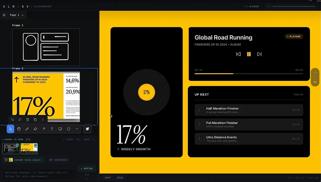 從純文本聊天,到看圖寫代碼,再到自己瀏覽網頁執行,這其實就是AI工作流一步步進化過來的路。X上不少人評價說“GLM-5V-Turbo讓編程迴歸正道了,產品開發的正確順序本來就該是先看、再做”,還有人直接扔張草圖就生成了音樂播放器那種帶交互的App,真正實現了所見即所得。