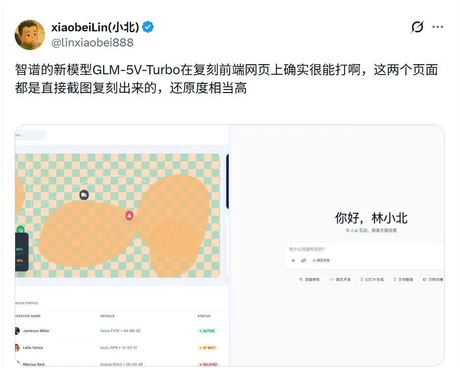 真正用起來,前端開發者最有感覺。你隨便甩一張草圖、設計稿或者別人網站的截圖過去,模型一眼就懂,直接吐出一整段能跑的前端代碼,配色和交互細節都還原得挺到位。X上已經有開發者實測了,直接拿截圖復刻兩個前端頁面,還原度高到讓人眼前一亮。